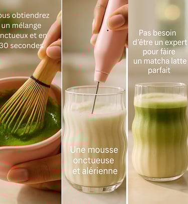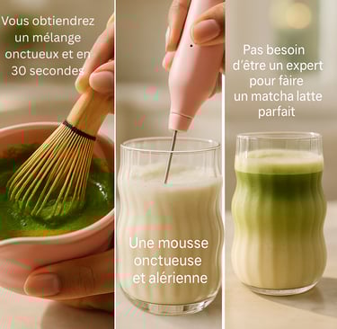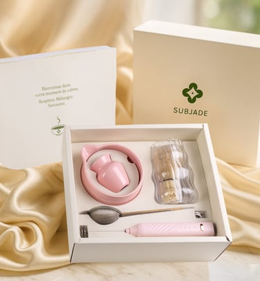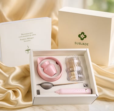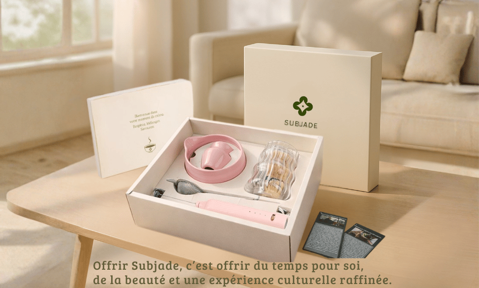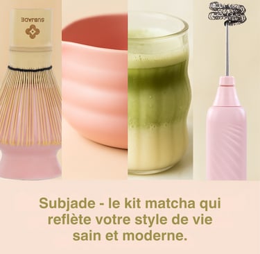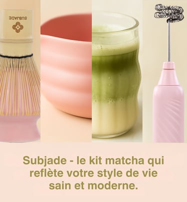 Des kits matcha, verres à matcha, matcha stations, gourdes, accessoires et objets du quotidien — tous imaginés sous l’identité Subjade.