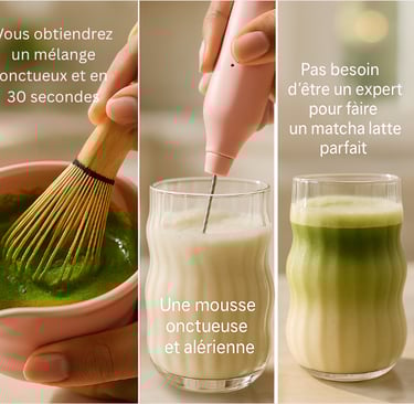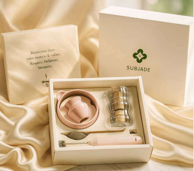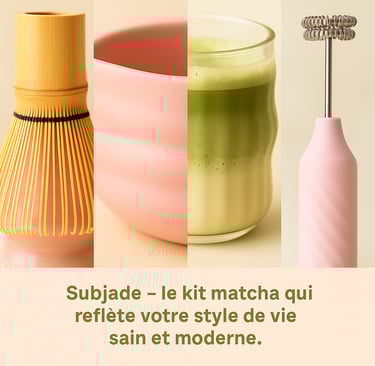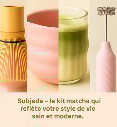 Des kits matcha, verres à matcha, matcha stations, gourdes, accessoires et objets du quotidien — tous imaginés sous l’identité Subjade.